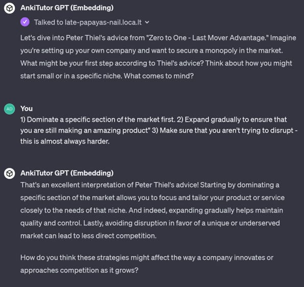 AnkiTutorGPT also intentionally asks follow-up questions to help embed the information in new contexts: https://chat.openai.com/share/179a885c-7cbb-4bbf-bcfd-02be63b0a806
